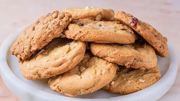 Mix of cookie favourites: rich chocolate chip, buttery white chocolate macadamia nut, and hearty oatmeal cranberry walnut cookies, perfect for sharing.