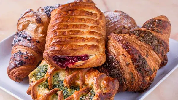 An assorted selection of freshly baked pastries. Includes a variety of croissants, turnovers, scones & danishes.
