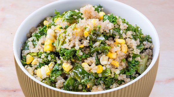 Hearty kale, sweet corn, and protein-packed quinoa, tossed with fresh veggies and a light dressing for a wholesome, satisfying salad.